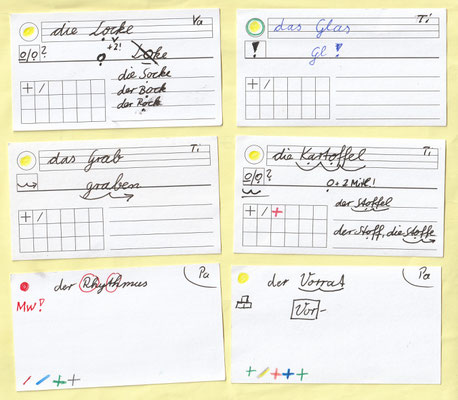 Diese Beispiele sollen zeigen, wie man die Lernkärtchen auf der Basis konkreter Fehlschreibungen anlegt und wie die Übungsergebnisse in der jeweiligen "Wochenfarbe" mit einem "/" oder einem "+" festgehalten werden. Bewusst verwenden wir kein "-", weil jedes Schreiben nach Diktat als neuer Schreibversuch anzusehen ist, da seit dem letzten Versuch eine ganze Woche vergangen ist. Der Schreibversuch kann, muss aber nicht gelingen. Eine Fehlschreibung darf daher nicht negativ bewertet werden. Auch nicht durch einen vorwurfsvollen Ton oder Blick!