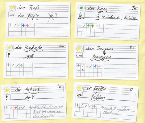 Wir bauen die Lernkartei mit den hier abgebildeten Wortkärtchen auf, aber wie die letzten beiden Beispiele zeigen, können auch einfache linierte oder sogar, wie in den unteren Beispielen, unlinierte Karteikärtchen verwendet werden. Wichtig ist nur: Wenn wir die Lernenden möglichst effektiv unterstützen wollen, sollten wir ihnen Hinweise zur zukünftigen Fehlervermeidung geben. Die abgebildeten Kärtchen können bei mir zu recht günstigen Preisen bestellt werden, weil wir sie in größerer Stückzahl drucken lassen